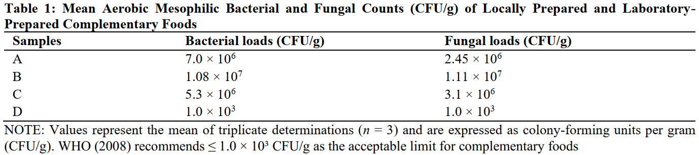 Locally (Indigenous) prepared complementary foods are widely consumed by infants in Nigeria because of their affordability and accessibility; however, their microbiological safety remains a major public health concern. This study evaluated the microbiological quality of three locally prepared complementary food samples (Samples A, B, and C) sold in Tarauni Local Government Area, Kano State, in comparison with a laboratory-prepared counterpart (Sample D). The market samples were unbranded, powdered formula, and sold under open conditions, potentially exposing them to contamination. Standard microbiological methods were employed: Nutrient Agar for aerobic mesophilic bacterial counts, Potato Dextrose Agar for fungal isolation, and the Most Probable Number (MPN) method for coliform estimation, while pathogens were identified through biochemical tests. The aerobic mesophilic bacterial counts of the locally prepared foods ranged from 2.45 × 10⁶ to 1.08 × 10⁷ CFU/mL, exceeding the WHO permissible limit of 1.0 × 10³ CFU/mL. Fungal contaminants detected included Aspergillus niger, A. fumigatus, and A. flavus. Coliform counts reached up to 150 MPN/100 mL, and pathogens such as Escherichia coli, Staphylococcus aureus, and Shigella spp were present in the market samples but absent in the laboratory-prepared food, which remained within safety limits. These findings reveal significant microbiological risks associated with locally prepared complementary foods. Strengthening vendor hygiene practices, enforcing regulatory surveillance, and promoting laboratory-standard local formulations are recommended to safeguard infant health.